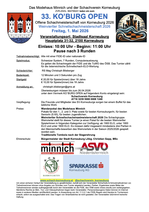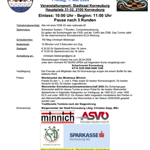 Auch in diesem Jahr lädt der Schachverein Korneuburg am 1. Mai 2026 zum traditionellen Ko’Burg Open – dieses Jahr bereits zum 33. Mail! Das Turnier findet wie im letzten Jahr im neuen Veranstaltungsort Stadtsaal von Korneuburg Hauptplatz 31-32, 2100 Korneuburg statt. Es gibt wieder ein separates Jugendturnier! Ausschreibung 33. Ko’burg […]